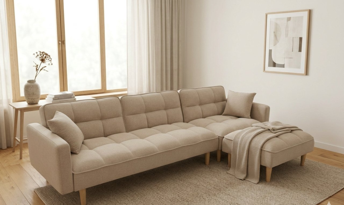 El sofá Modelo Brando destaca por su diseño moderno y estilo nórdico. Confort, elegancia y personalización en telas y colores. En tienda esta disponible modelo 3 plazas cama + pouff y color camel.